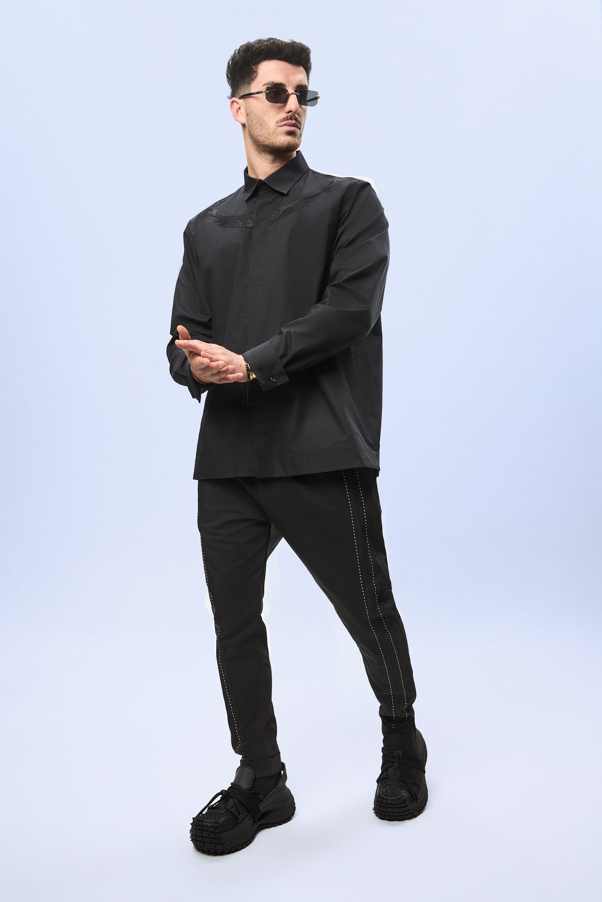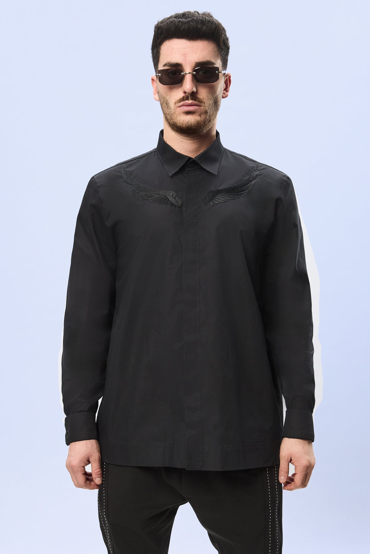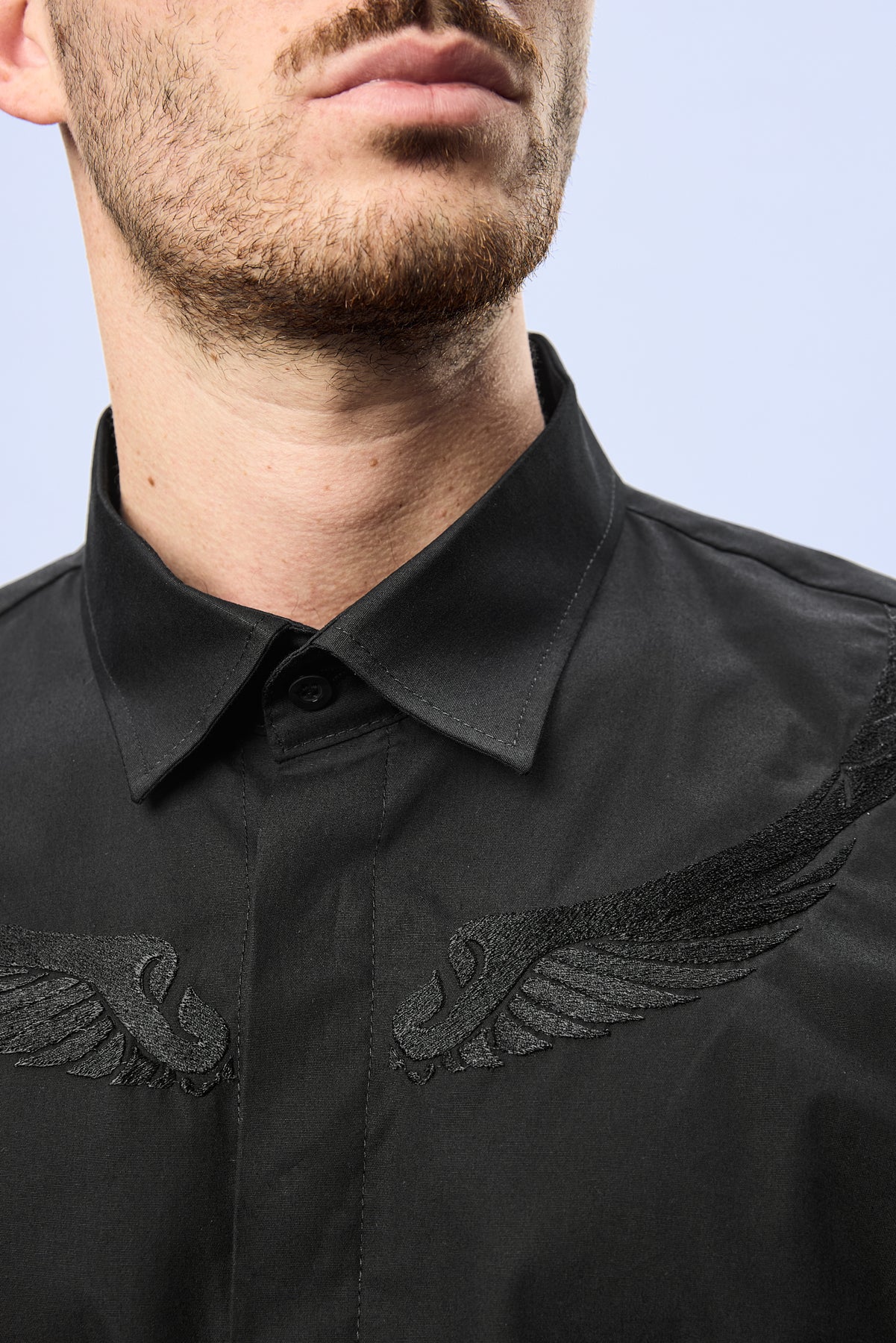 Designul este definit de broderia sofisticata din partea superioara a pieptului, realizata sub forma unor aripi stilizate care se intind simetric de o parte si de alta a liniei centrale a camasii. Executata cu precizie in aceeasi nuanta de negru intens, broderia creeaza un efect vizual subtil, dar puternic, evidentiind jocul delicat dintre textura materialului si relieful cusaturii.