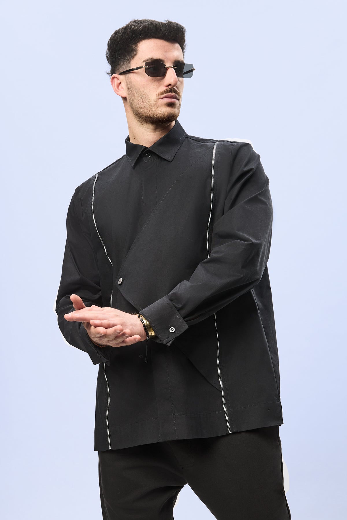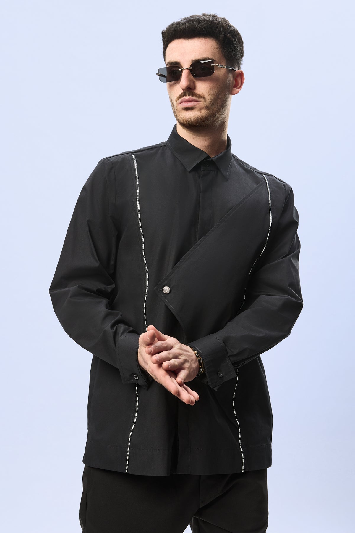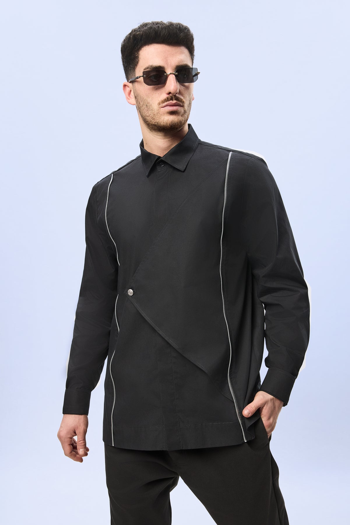 Croiala este precisa si echilibrata, urmarind linia corpului intr-o maniera eleganta, in timp ce gulerul clasic si finisajele atent executate pastreaza rafinamentul piesei. Jocul dintre liniile curate, structura asimetrica si accentele metalice transforma camasa intr-o piesa cu o identitate vizuala distincta.