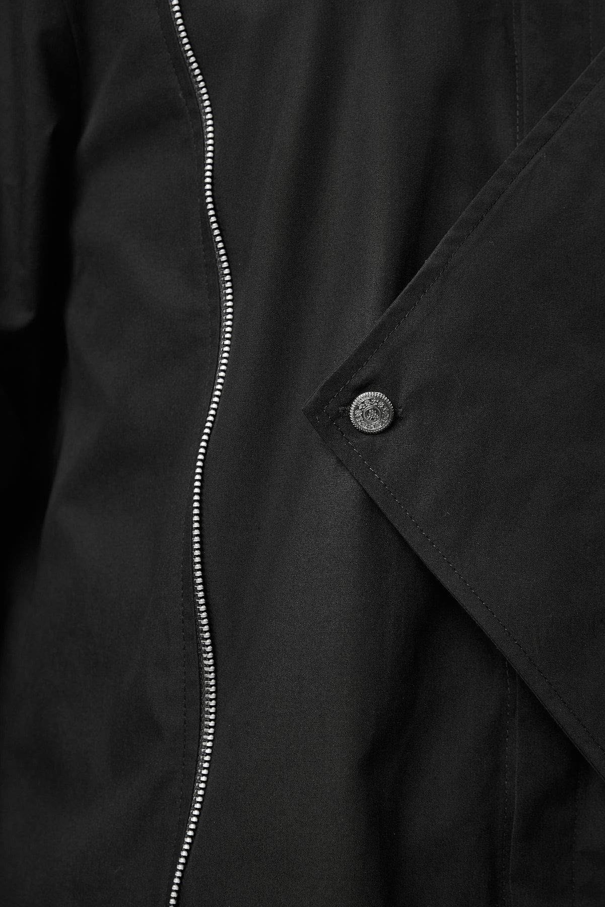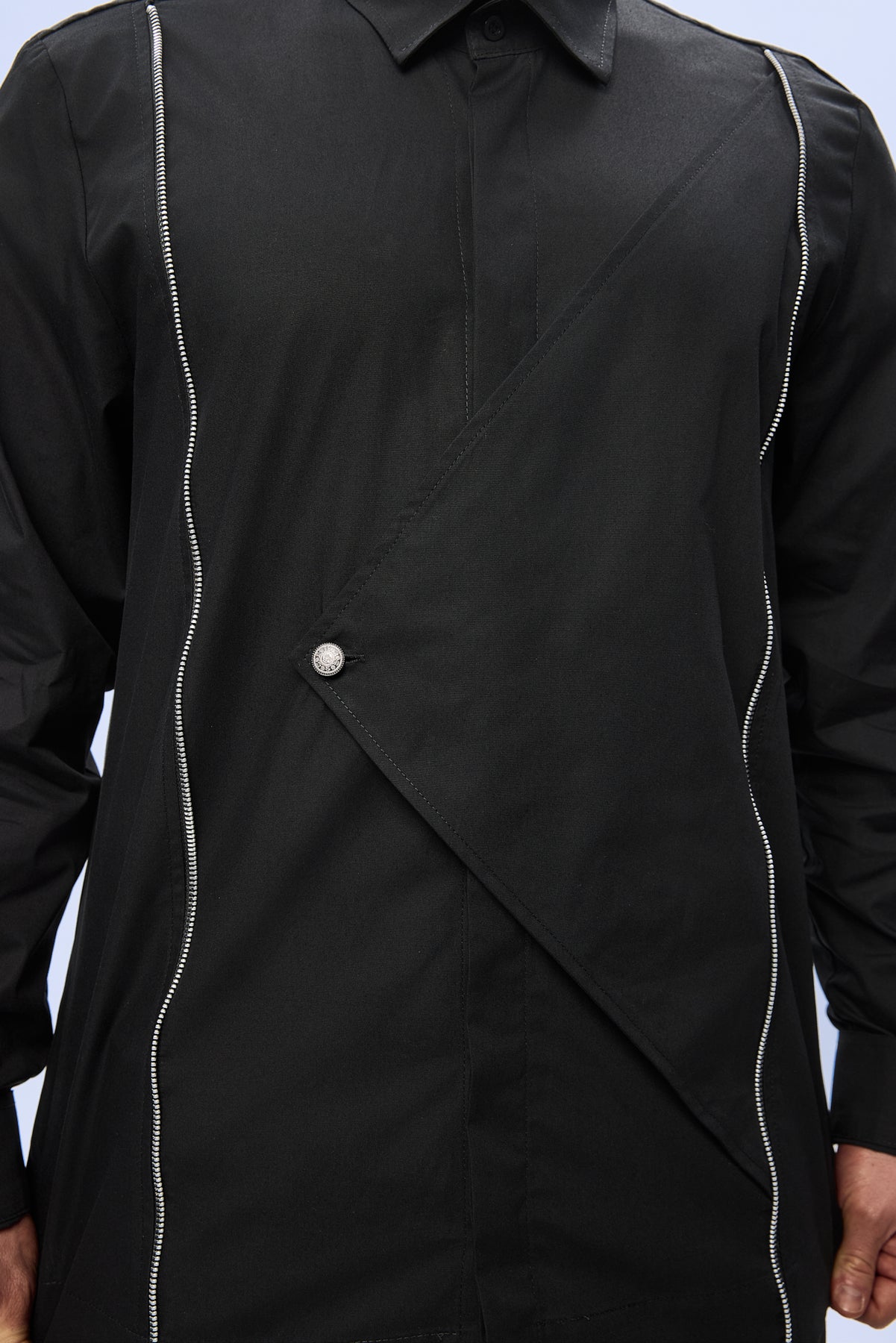 Designul este definit de liniile grafice si de constructia asimetrica, ce creeaza o compozitie vizuala puternica. Elementul suprapus, fixat printr-un nasture metalic decorativ evidentiaza atentia pentru detalii. Insertiile verticale cu fermoare metalice fine contureaza silueta si formează un contrast subtil intre tesatura mata a bumbacului si reflexiile discrete ale elementelor metalice.