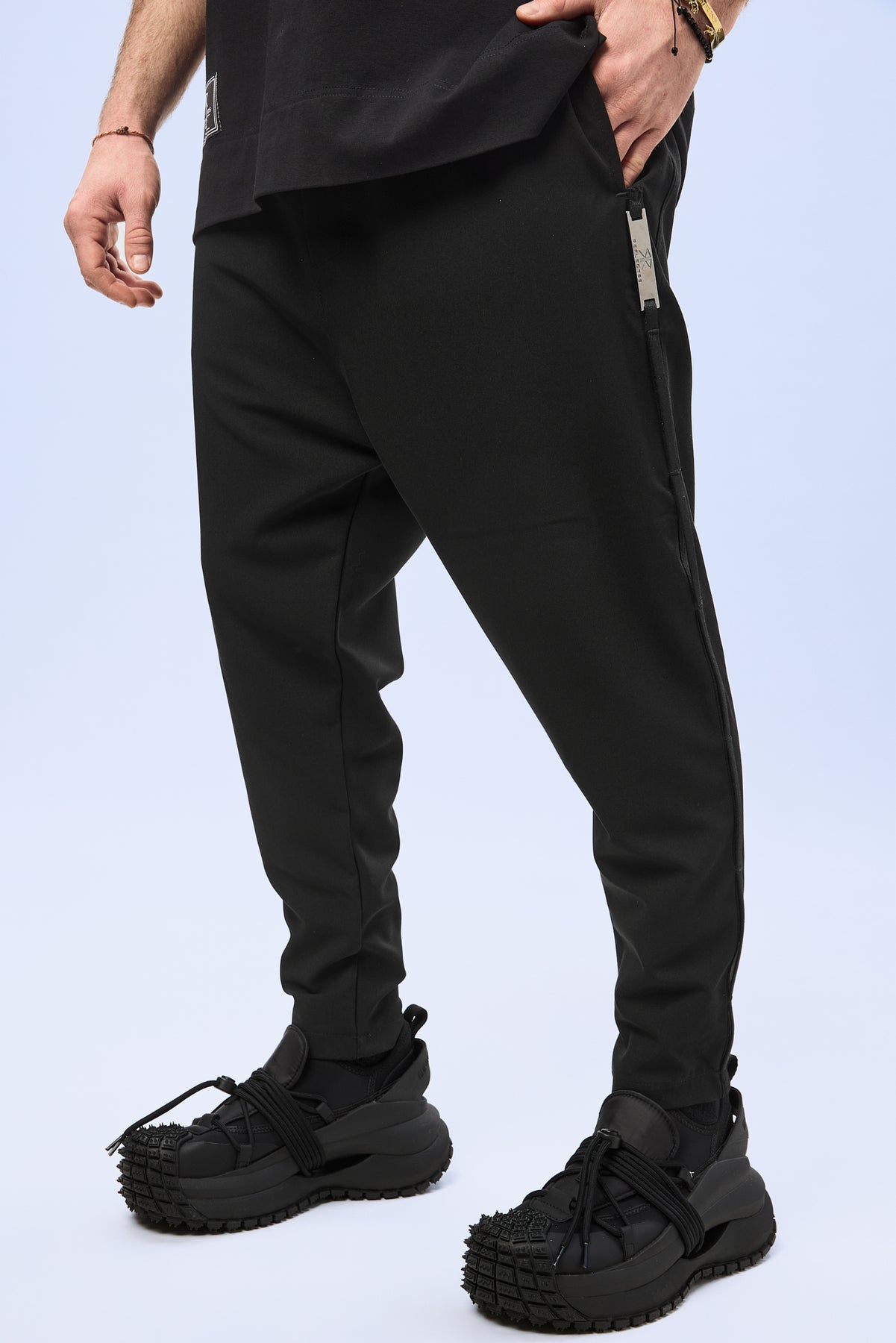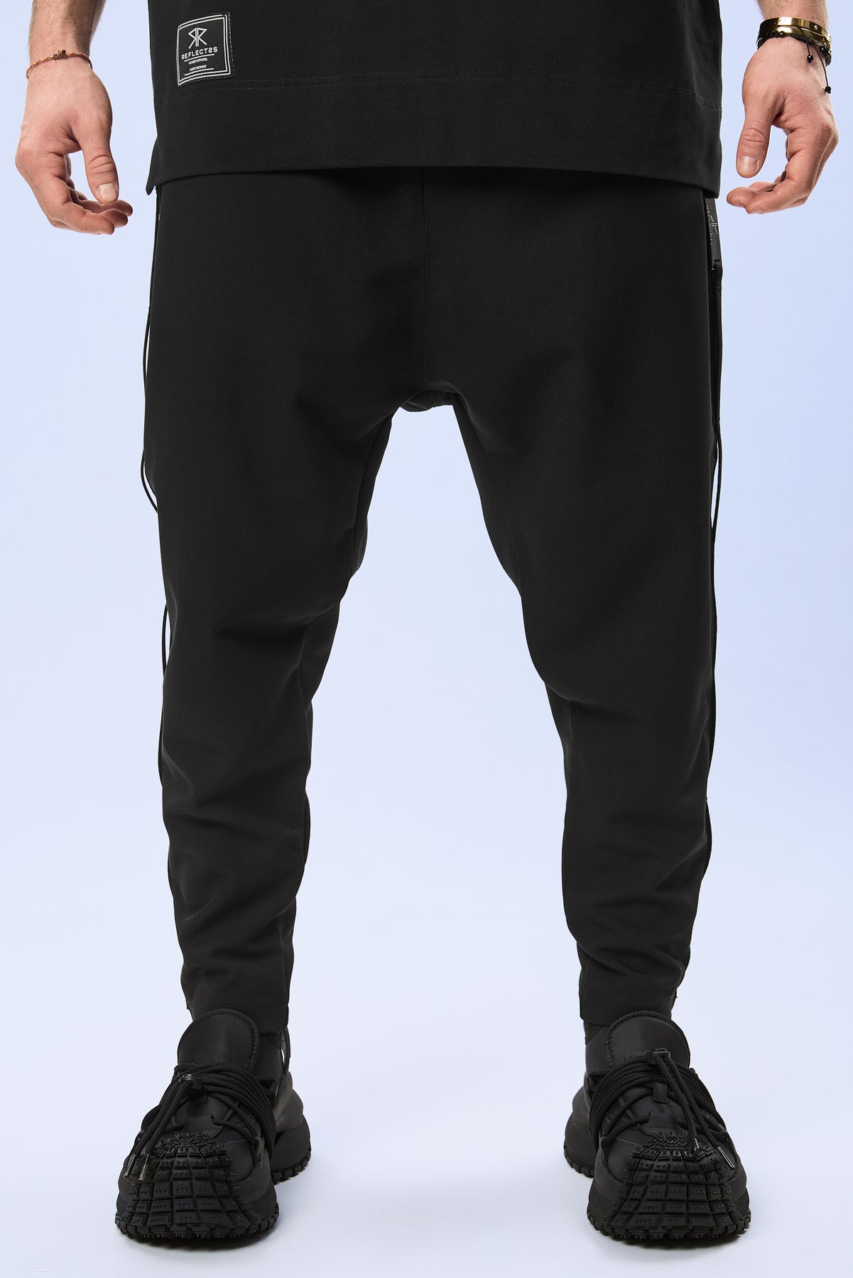Elementul distinctiv al piesei este accesoriul metalic gravat Reflectss, pozitionat discret pe lateral, un detaliu statement care subliniaza identitatea exclusivista a designului si adauga o nota sofisticata outfitului. Contrastul dintre materialul elegant si accentul metalic transforma piesa intr-un element urban cu personalitate.