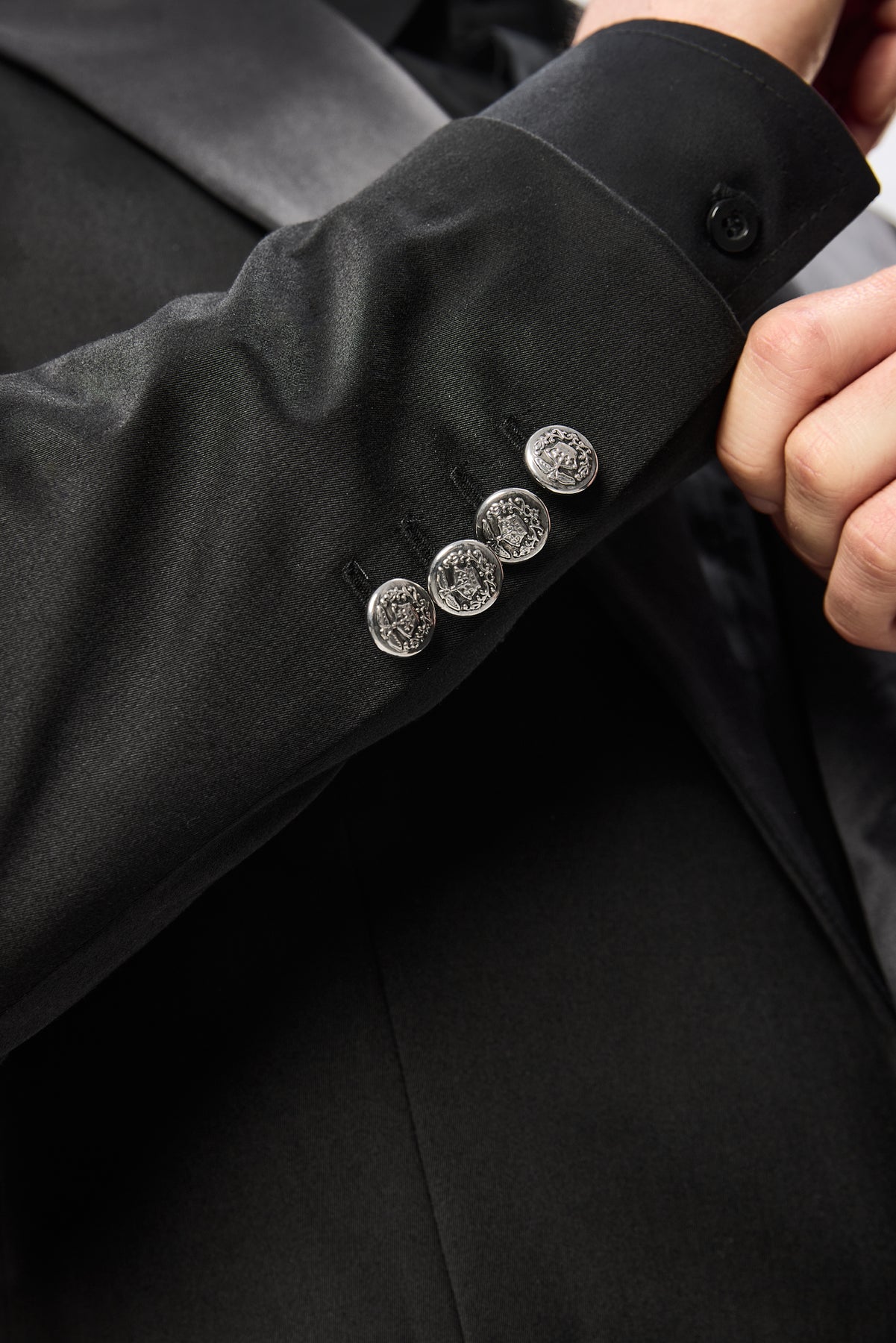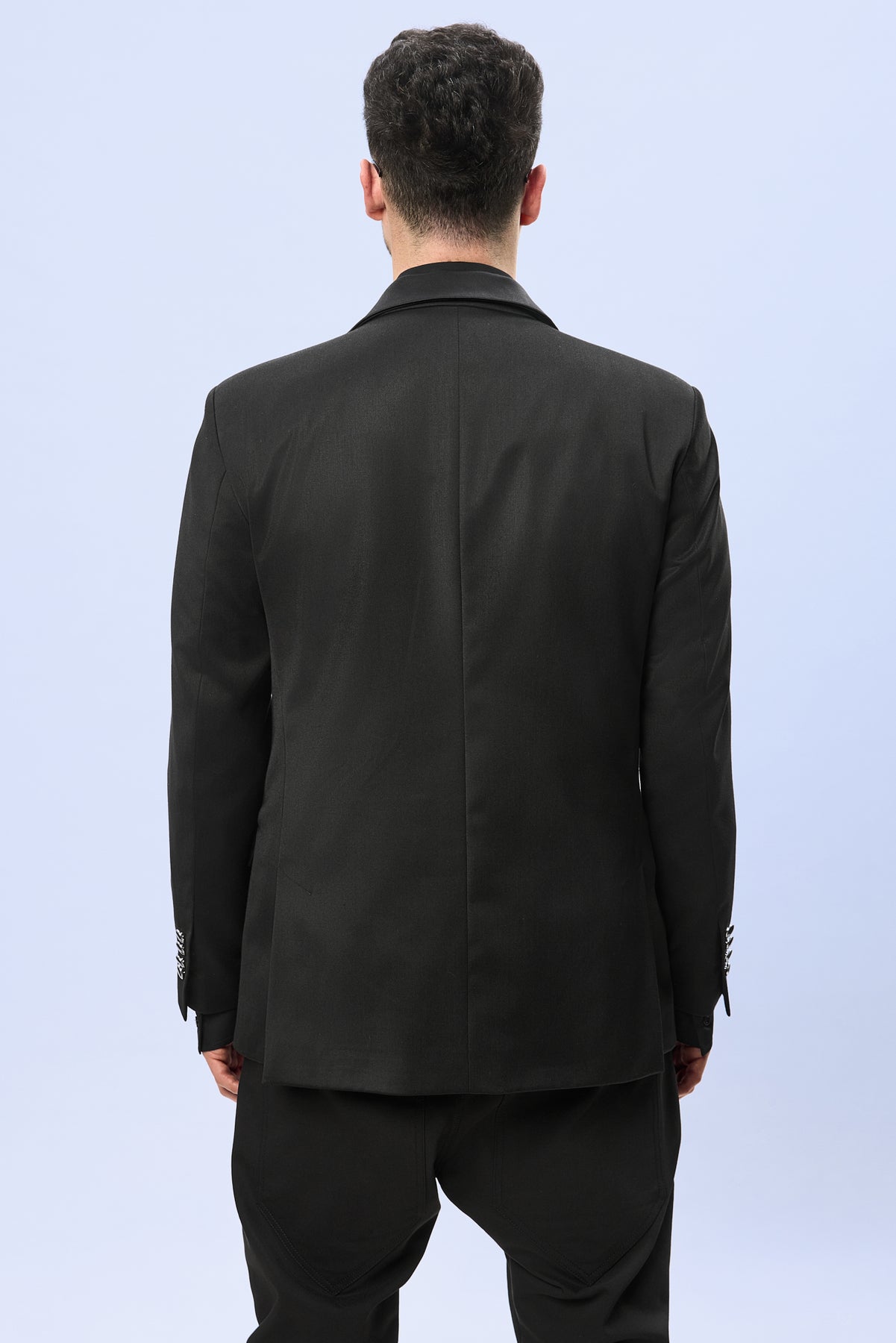 Buzunarul de piept si buzunarele laterale sunt integrate cu precizie in structura sacoului, pastrand fluiditatea liniilor si echilibrul. Textura profunda a stofei, luciul elegant al reverelor si finisajele metalice creeaza un intreg plin de personalitate.
