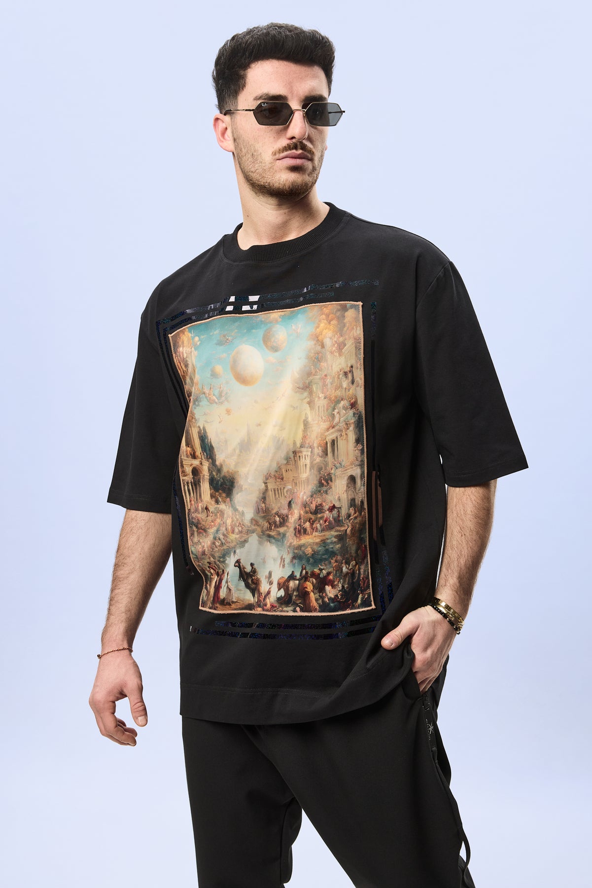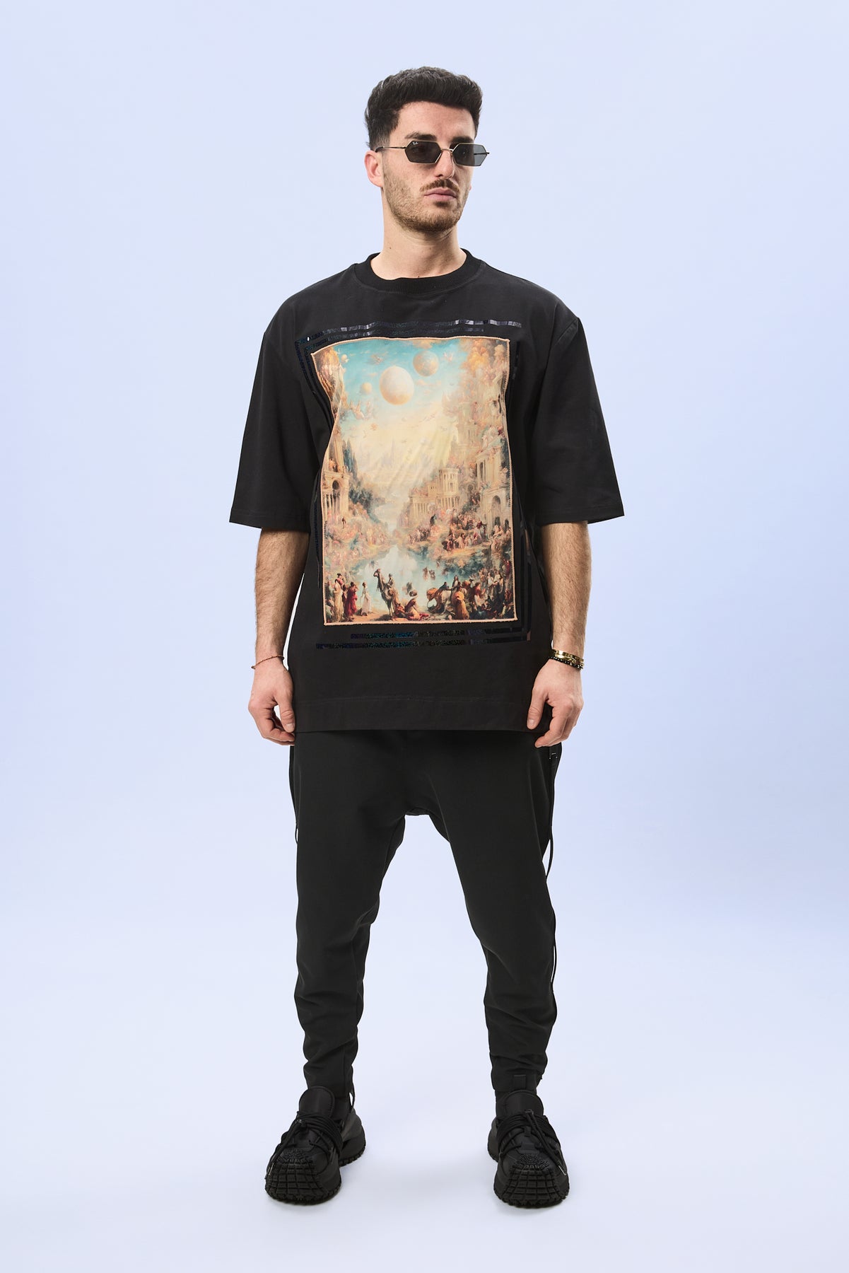 Aplicatiile negre contrastante, integrate in jurul printului, adauga profunzime si accentueaza caracterul contemporan al designului. Aceste detalii creeaza un echilibru intre estetica urbana si rafinamentul materialelor premium, oferind personalitate oircarui outfit.