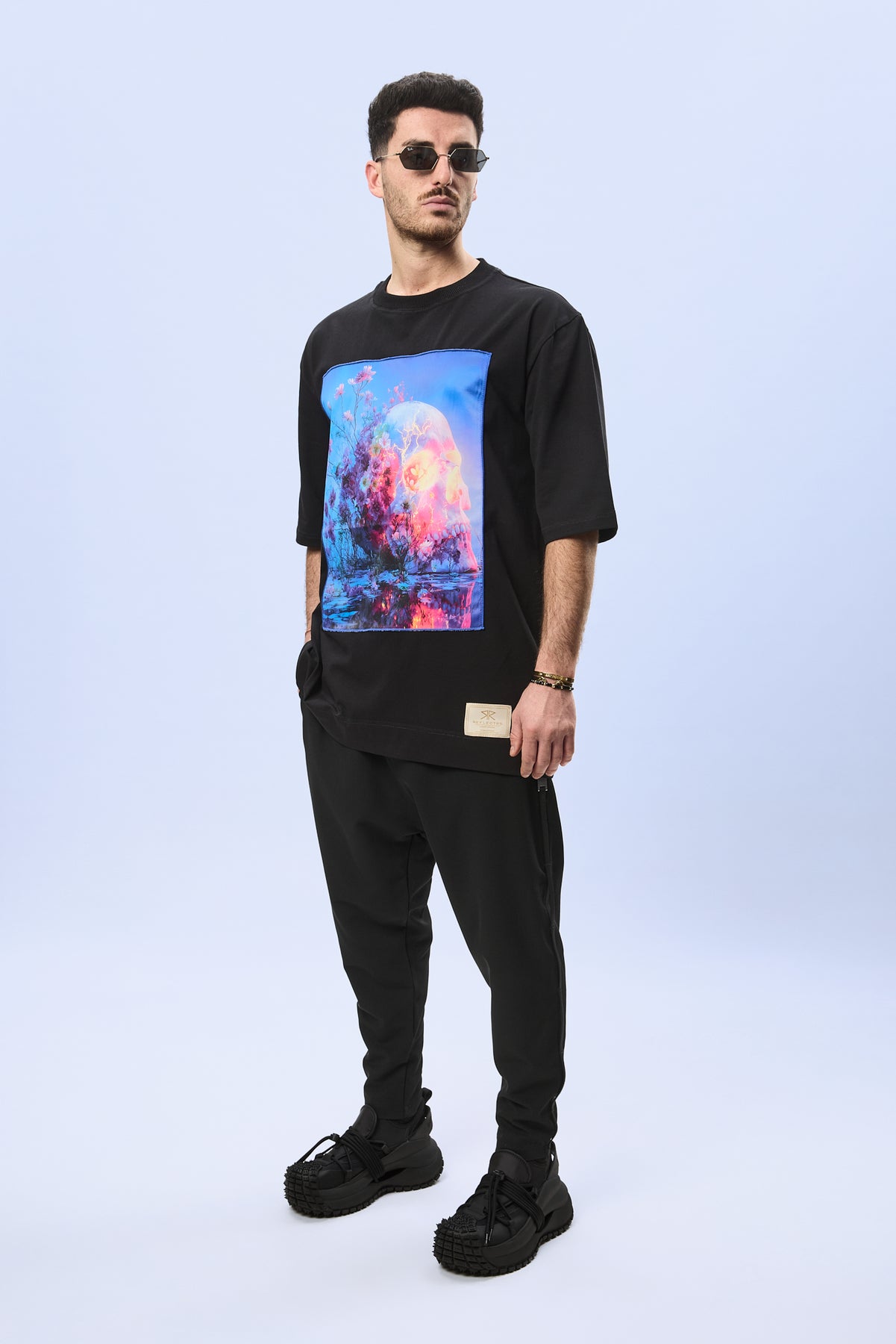 Elementul central al designului este printul amplu, realizat pe satin printr-o tehnologie laser de ultima generatie, care permite redarea unor detalii extrem de fine si a unor culori vibrante. Compozitia grafica creaza un contrast puternic intre textura lsatinata si suprafata mata a bumbacului.